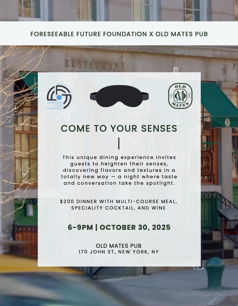 Foreseeable Future Foundation partnered with Old Mates Pub in New York City to host Come to Your Senses, a blindfolded dinner dining experience. Sighted attendees gained insight into the challenges faced by the visually impaired community while connecting with others in an unforgettable evening.